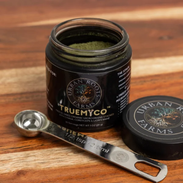 What’s Inside: TrueMyco is crafted from a carefully selected blend of the most nutrient-dense microgreens—broccoli, kale, red acre cabbage, pea tendrils, purple Rambo radish, arugula, and beets—stacked with three organic functional mushrooms: Chaga, Cordyceps, and Lion’s Mane, grown and harvested in Colorado by Mycolove Farm. Each ½ heaping teaspoon serving delivers concentrated microgreen nutrients plus the full functional mushroom stack through our cutting-edge freeze-drying process.